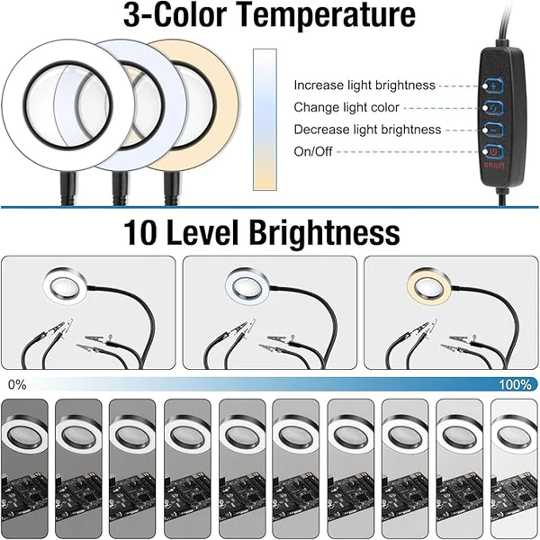 A 5 magnification dioptre with a 900 lm LED light on a gooseneck with 3 lights temperatures and 10 levels of brightness on each setting
