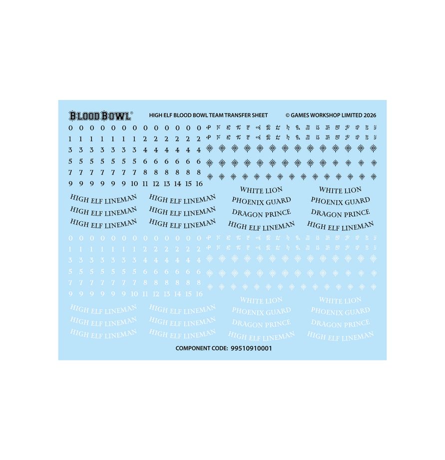 The High Elf Blood Bowl Team Transfer Sheet features 342 high-quality waterslide transfers. These include Caledor Dragons symbols, other High Elf icons, position names, and numbers to decorate your miniatures.