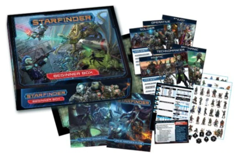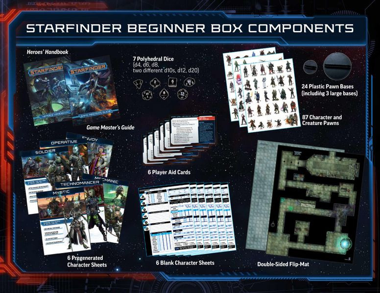 Launch into an exciting universe of science fantasy adventure with the Starfinder Beginner Box! Create and customize your own futuristic hero to play through challenging adventures and action-packed battles against dangerous foes! With streamlined rules, this deluxe boxed set is the ideal introduction to the Starfinder Roleplaying Game, an imaginative tabletop roleplaying game for 2-7 players. Welcome to the best launchpad for a lifetime of pulse-pounding adventure among the stars-the only limit is your imagination!